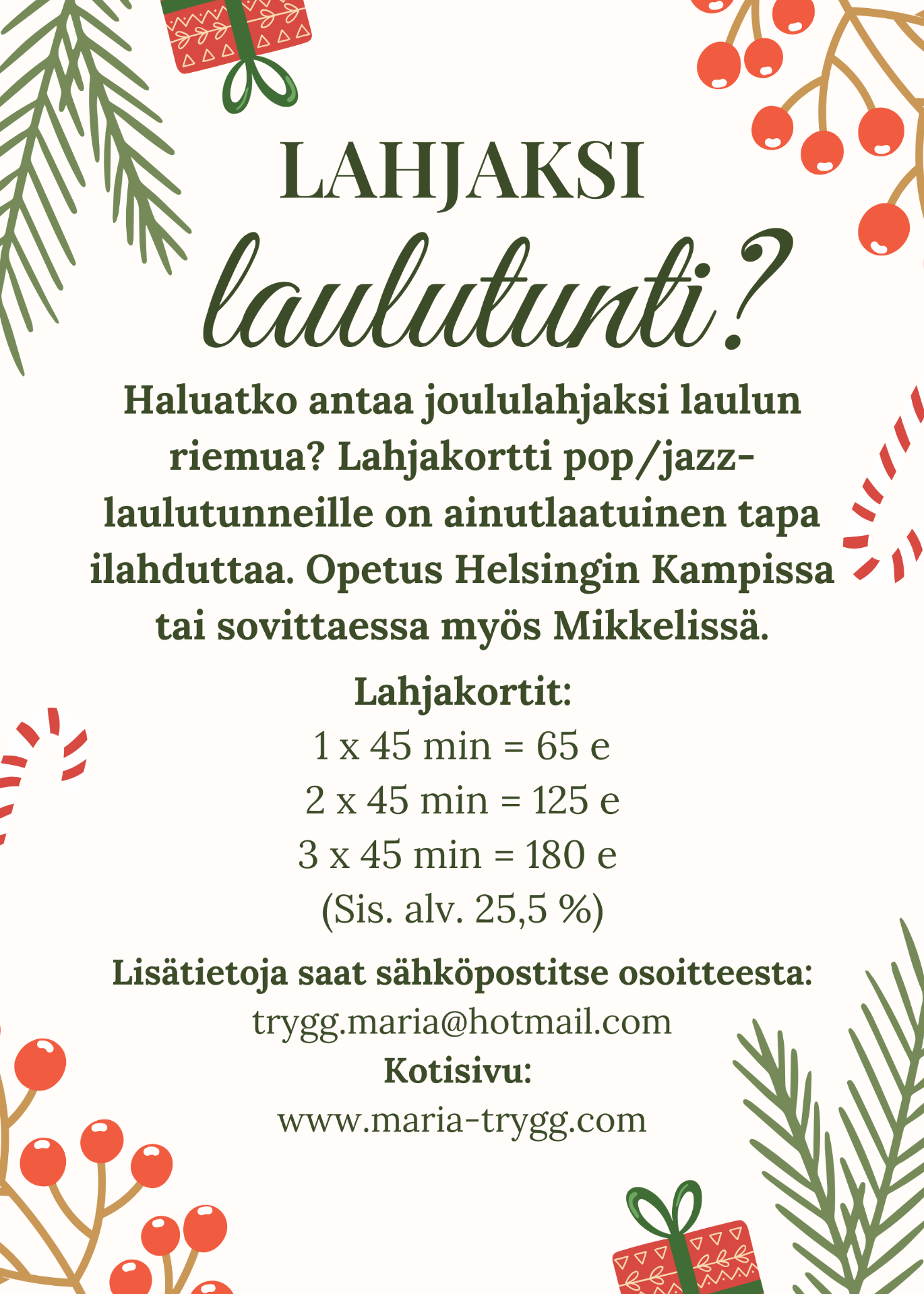Lahjakortin saa tilattua laittamalla minulle sähköpostia osoitteeseen trygg.maria@hotmail.com.